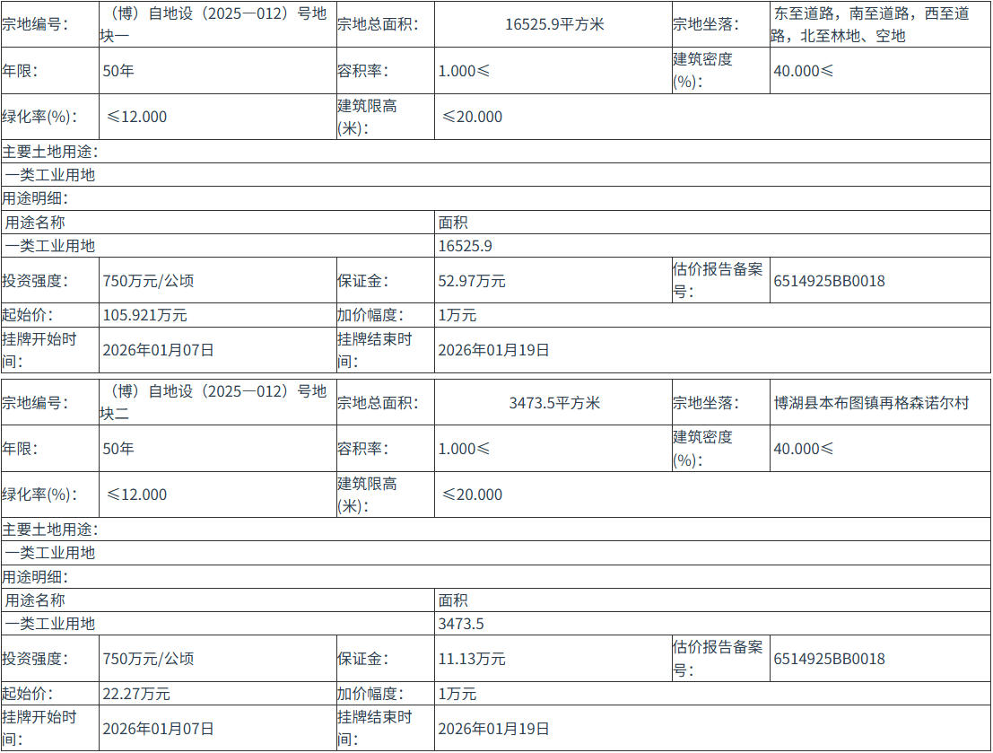 (博)自地設(shè)(2025—012)號(hào)地塊二 號(hào)地塊:2026年01月07日 10時(shí)00分 至 2026年01月19日 12時(shí)00分;