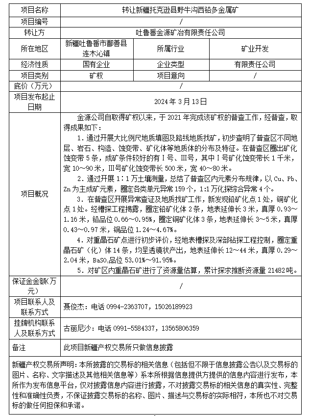 轉讓新疆托克遜縣野牛溝西鉛多金屬礦